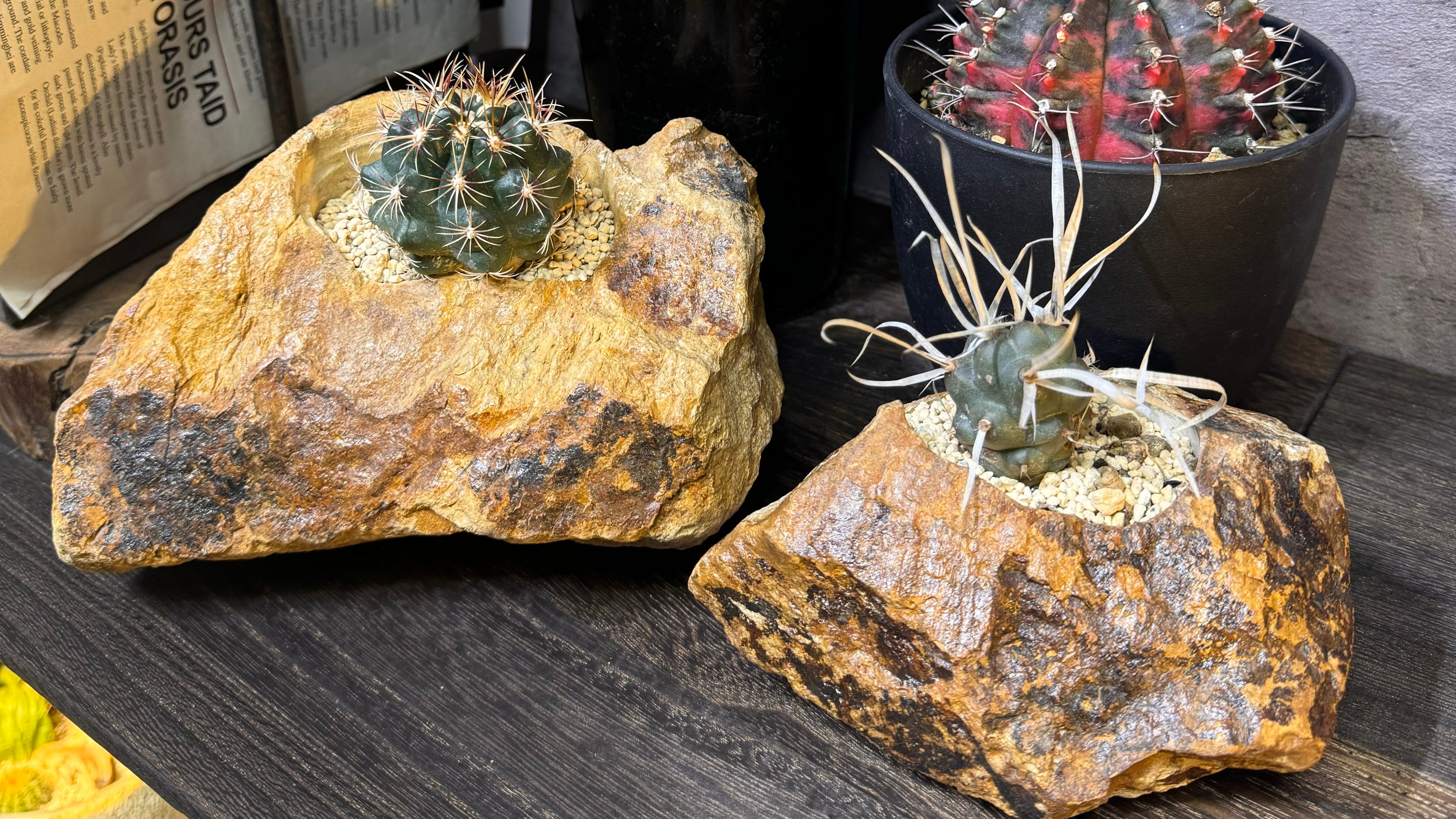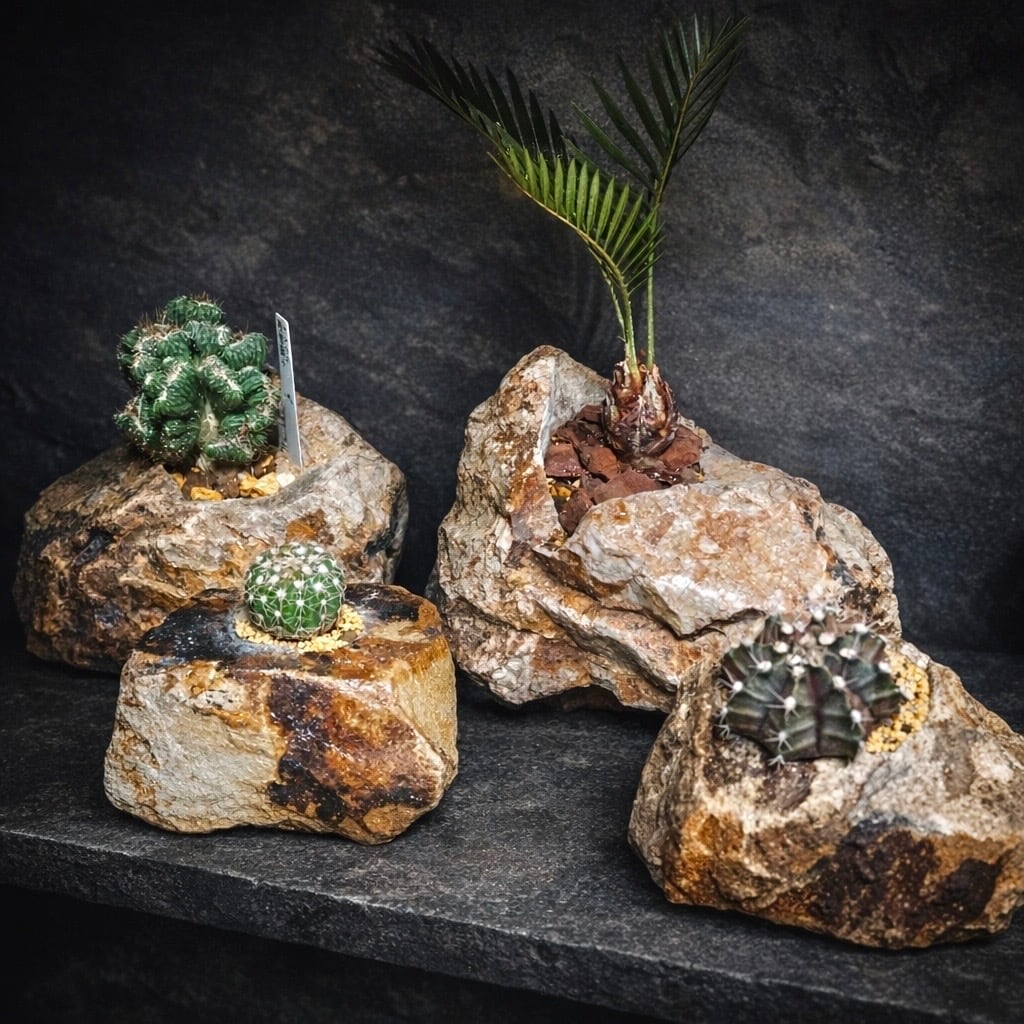 その重厚な質感と荒々しい石肌は、塊根植物やサボテン、多肉植物の魅力を最大限に引き立てくれます
